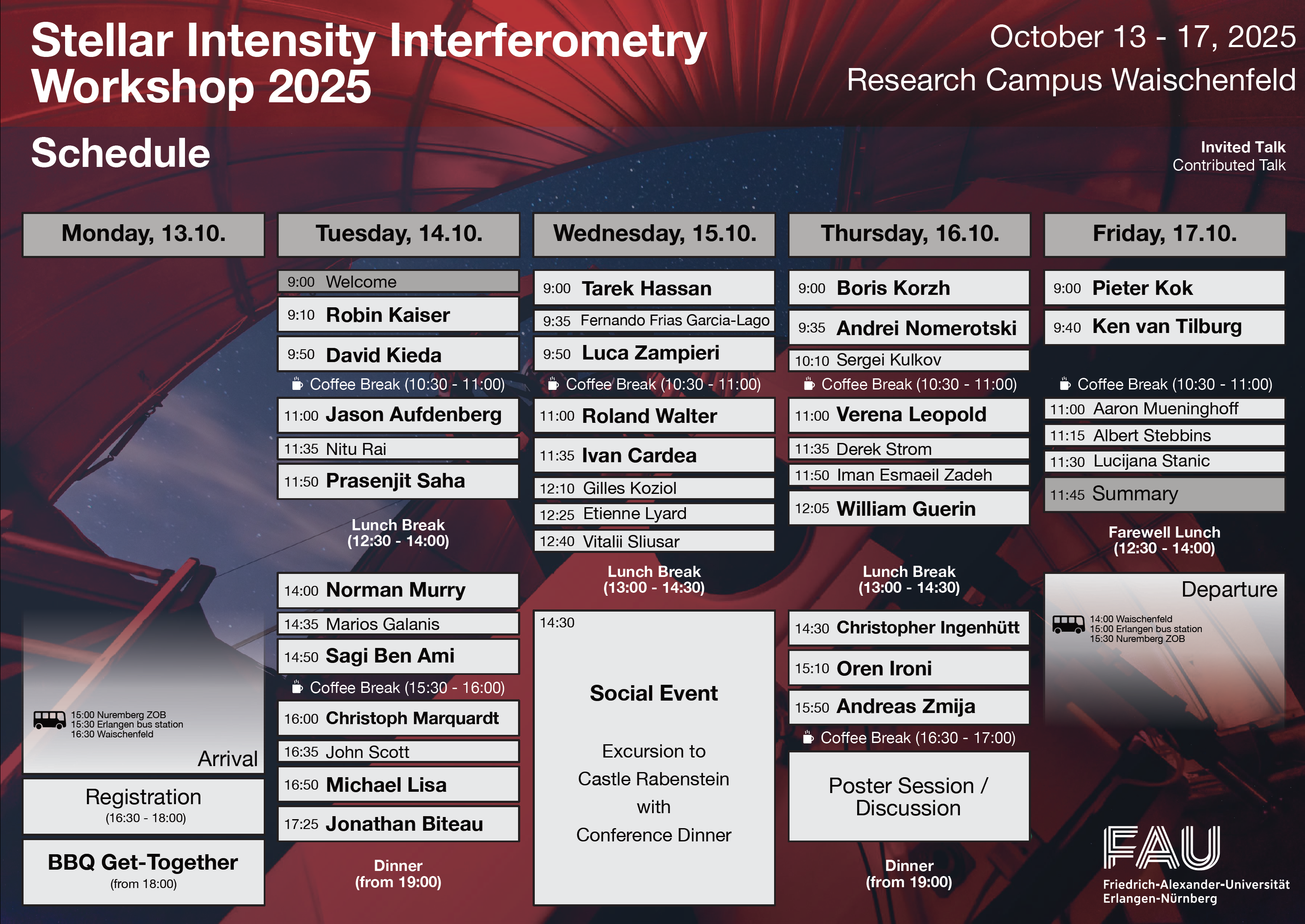 The workshop starts with a BBQ Get-Together on Monday evening. The scientific program starts on Tuesday morning. The workshop ends on Friday at noon. Departure will be on Friday after lunch.